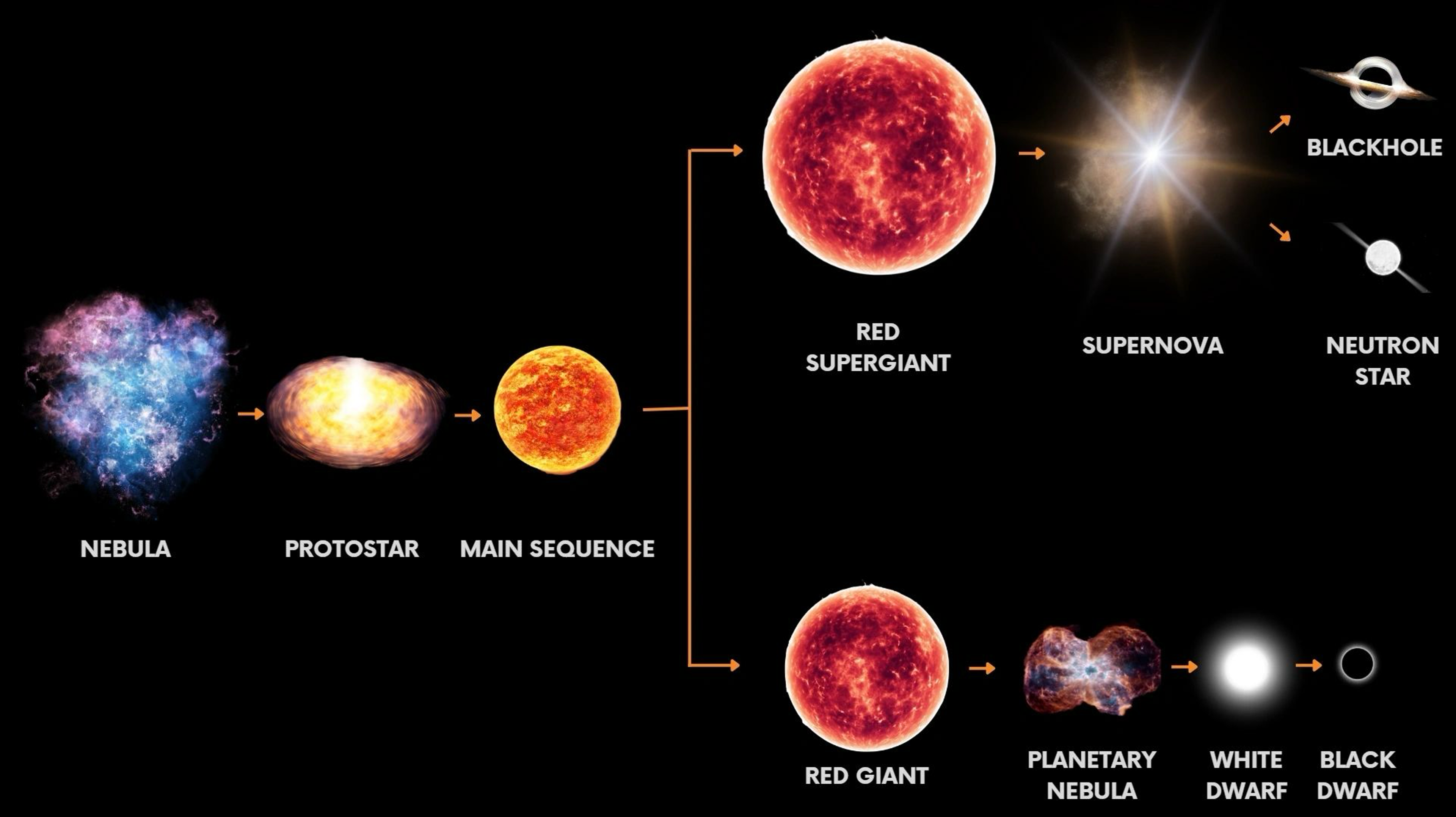 恒星诞生于巨大的星云——这些就像是它们的“摇篮”,由气体和尘埃组成。在引力挤压下,星云核心发生核聚变,于是恒星被“点亮”,可以发光发热几十亿年。但恒星的燃料会烧完。大质量恒星会以超新星爆发作为最后谢幕,这一刻比整个星系还亮。这些爆炸也是宇宙的“元素工厂”,喷出的铁和碳等物质,未来会变成新的星球甚至生命。