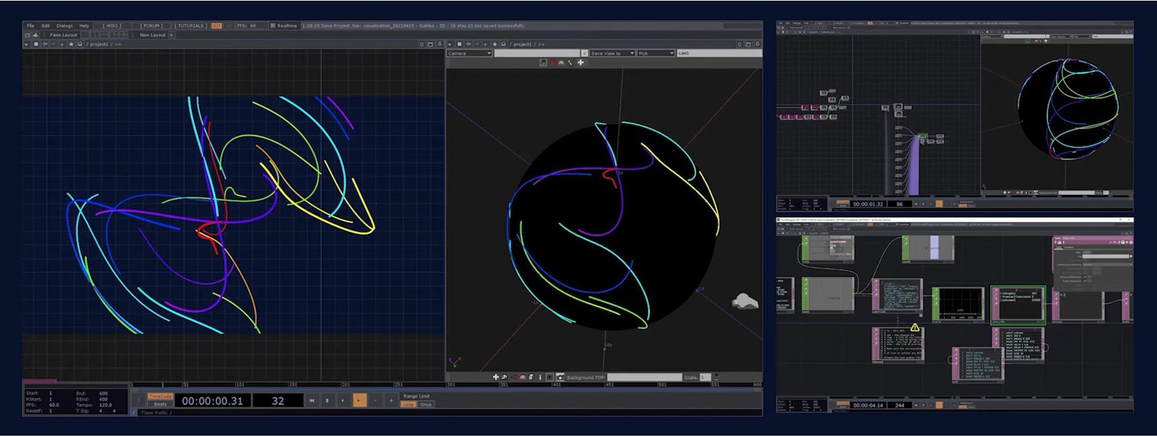 艺术家Smith与Gao运用了N2YO(Near 2 You Online,意为“近你在线”)的应用程序接口。这个接口能提供卫星的精确位置信息(包括经纬度与高度)。随后,他们通过TouchDesigner软件平台——一个专门用于创作交互式媒体的工具——将这些数据转化为视觉图像。每颗卫星的位置都会被映射到一幅画面中,其RGB色彩数值实时对应卫星的坐标,从而生成一幅实时变化的动态星图。